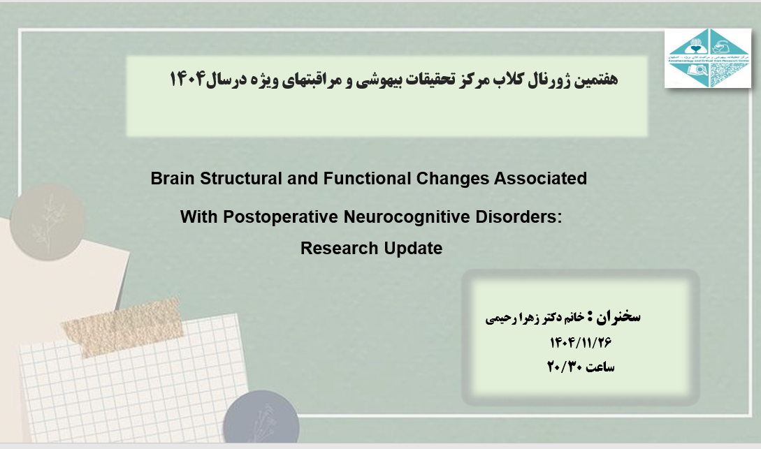 هفتمین جلسه ژورنال کلاب مرکز تحقیقات بیهوشی و مراقبتهای ویژه در سال 1404 هفتمین جلسه ژورنال کلاب مرکز تحقیقات بیهوشی و مراقبتهای ویژه در سال 1404 یکشنبه 1404/11/26